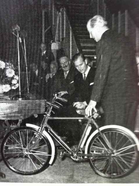 People are probably familiar with the fact that Prince Charles rode a Royal Enfield bicycle as a kid, here it is being presented to the Duke of Edinburgh by Major Smith,